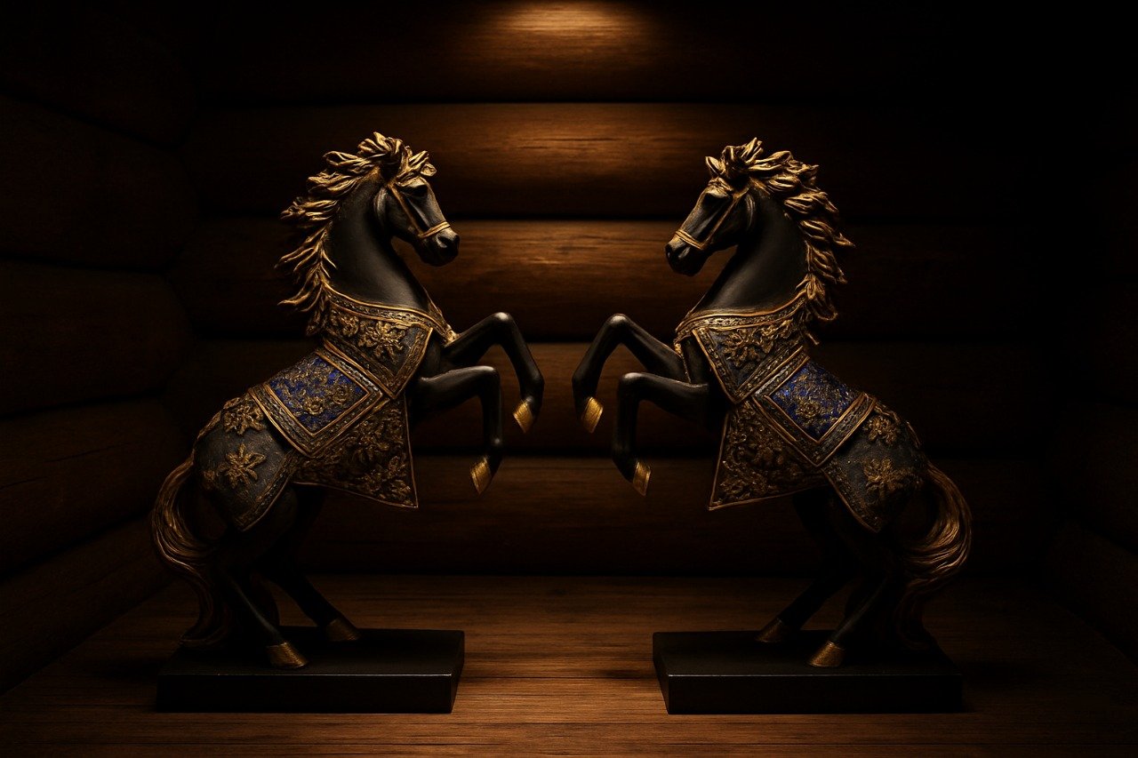 Exude grandeur and power with the Leafy Luxe Imperial Stallion Duo — a magnificent pair of rearing horse sculptures crafted to symbolize strength, success, and nobility. Each piece features intricate golden detailing over royal blue armor, finished with a lustrous sheen that reflects timeless luxury. Perfect for your living room, office, or entryway, these regal stallions bring a sense of balance, energy, and opulence to any space