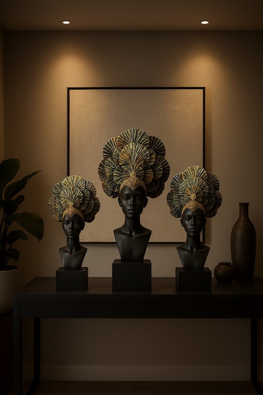 Celebrate timeless artistry and cultural grandeur with the Leafy Luxe Crowned Heritage Collection. This exquisite trio of bust sculptures, adorned with intricately detailed golden and leafy headdresses, reflects the elegance of royal traditions and the depth of heritage craftsmanship.