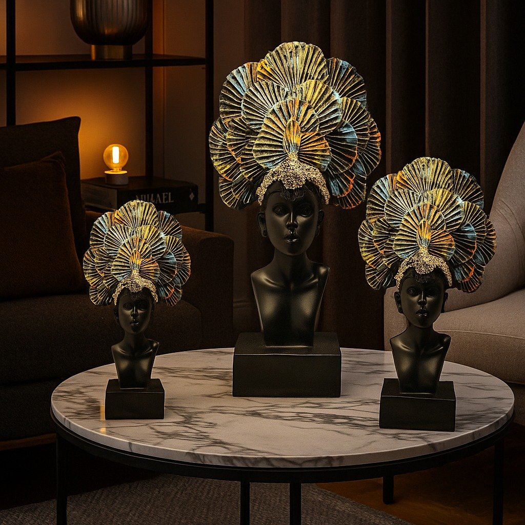 The Leafy Luxe Crowned Heritage Collection is a trio of regal bust sculptures with ornate golden headdresses. A perfect blend of heritage, artistry, and luxury for timeless home décor.