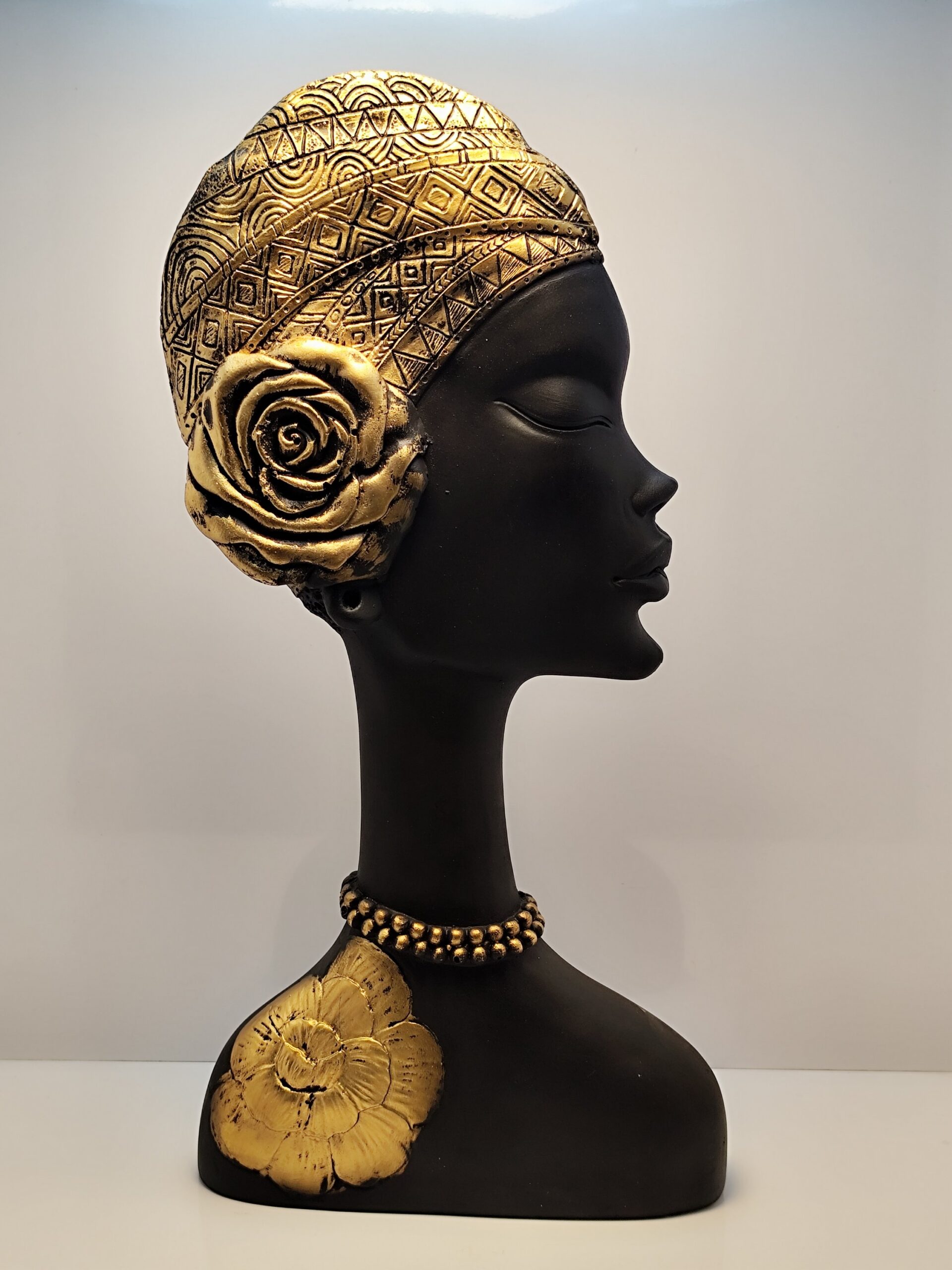 The LeafyLuxe Golden Grace captures serene beauty and timeless cultural artistry in a stunning sculptural form. Crafted with a smooth, deep matte finish, this regal bust is adorned with a meticulously detailed headwrap in radiant gold, featuring intricate geometric and swirling tribal patterns. The elegant elongated neck is accentuated by a bold gold beaded choker, completing the look of refined sophistication.