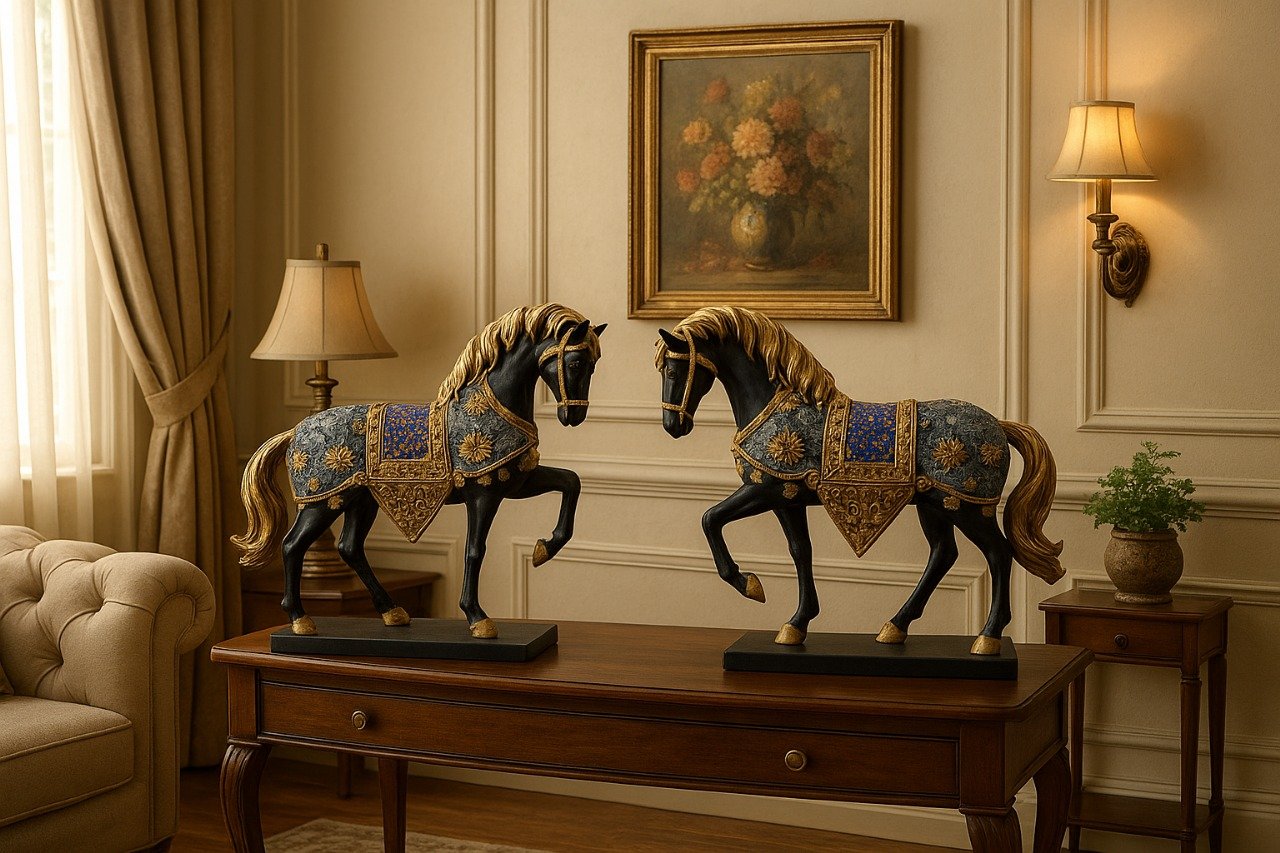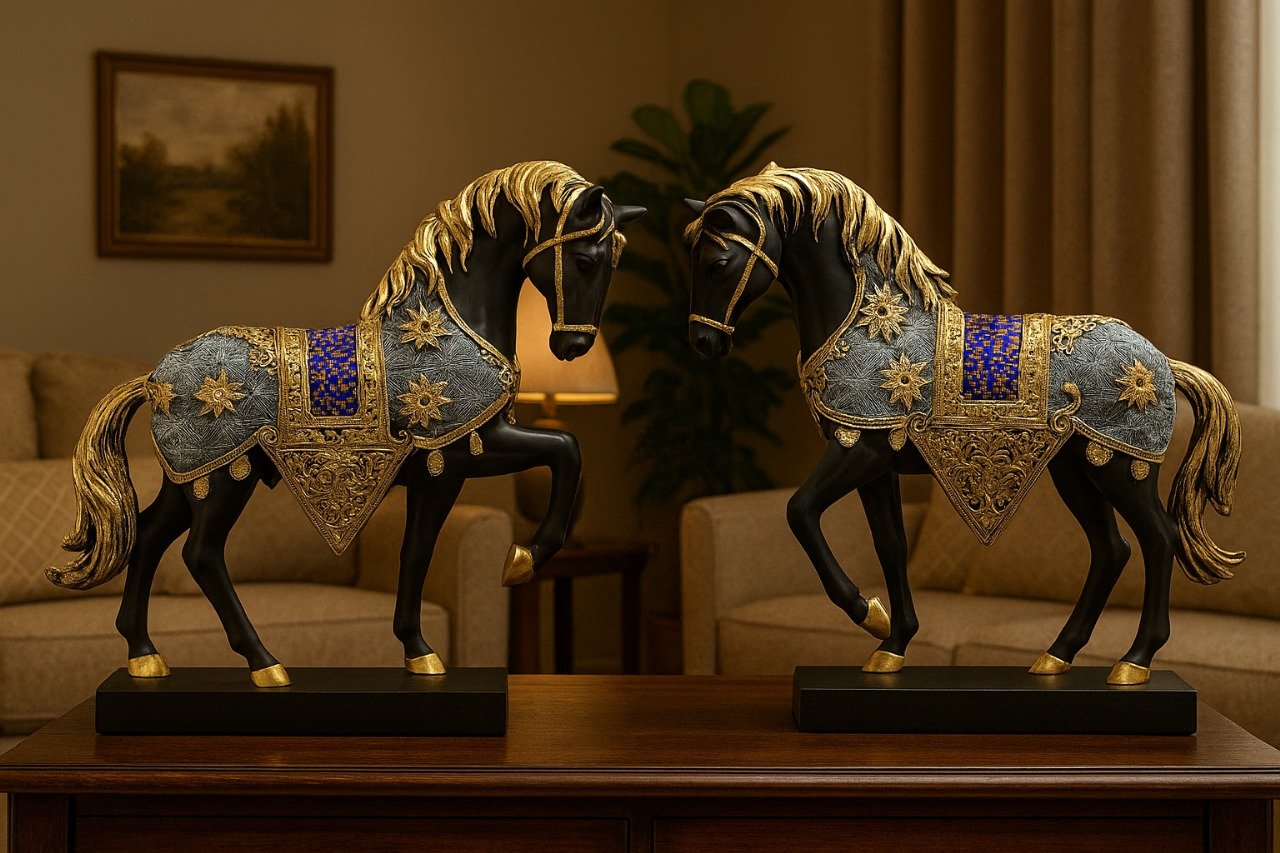 Perfect as a centerpiece for living rooms, luxury halls, or curated collections, the Imperial Cavalry Pair exudes sophistication and cultural richness. Whether gifted as a statement piece or showcased in your own home, it stands as a celebration of heritage, artistry, and enduring elegance — the true spirit of Leafy Luxe.The Leafy Luxe Imperial Cavalry Pair brings heritage and elegance into your home. With regal blue and gold detailing, these majestic horse figurines symbolize strength, nobility, and timeless luxury — perfect as a centerpiece or collector’s treasure.”