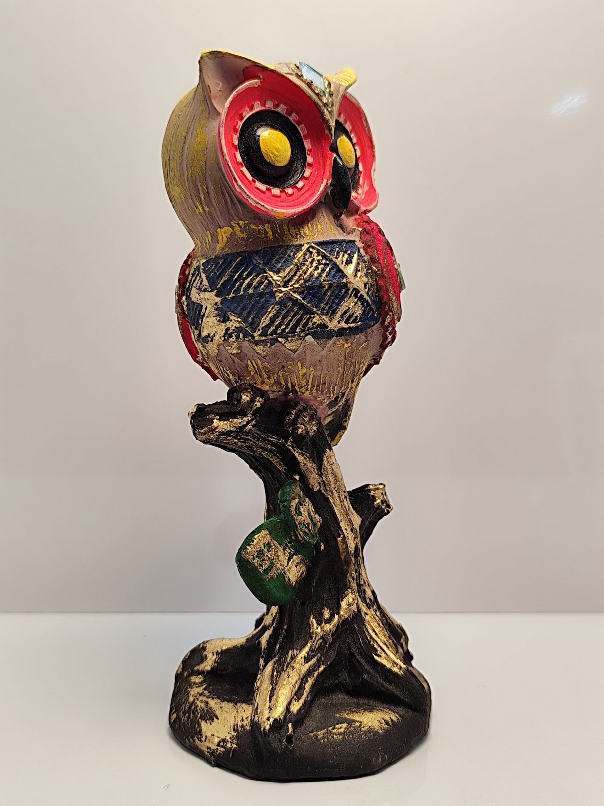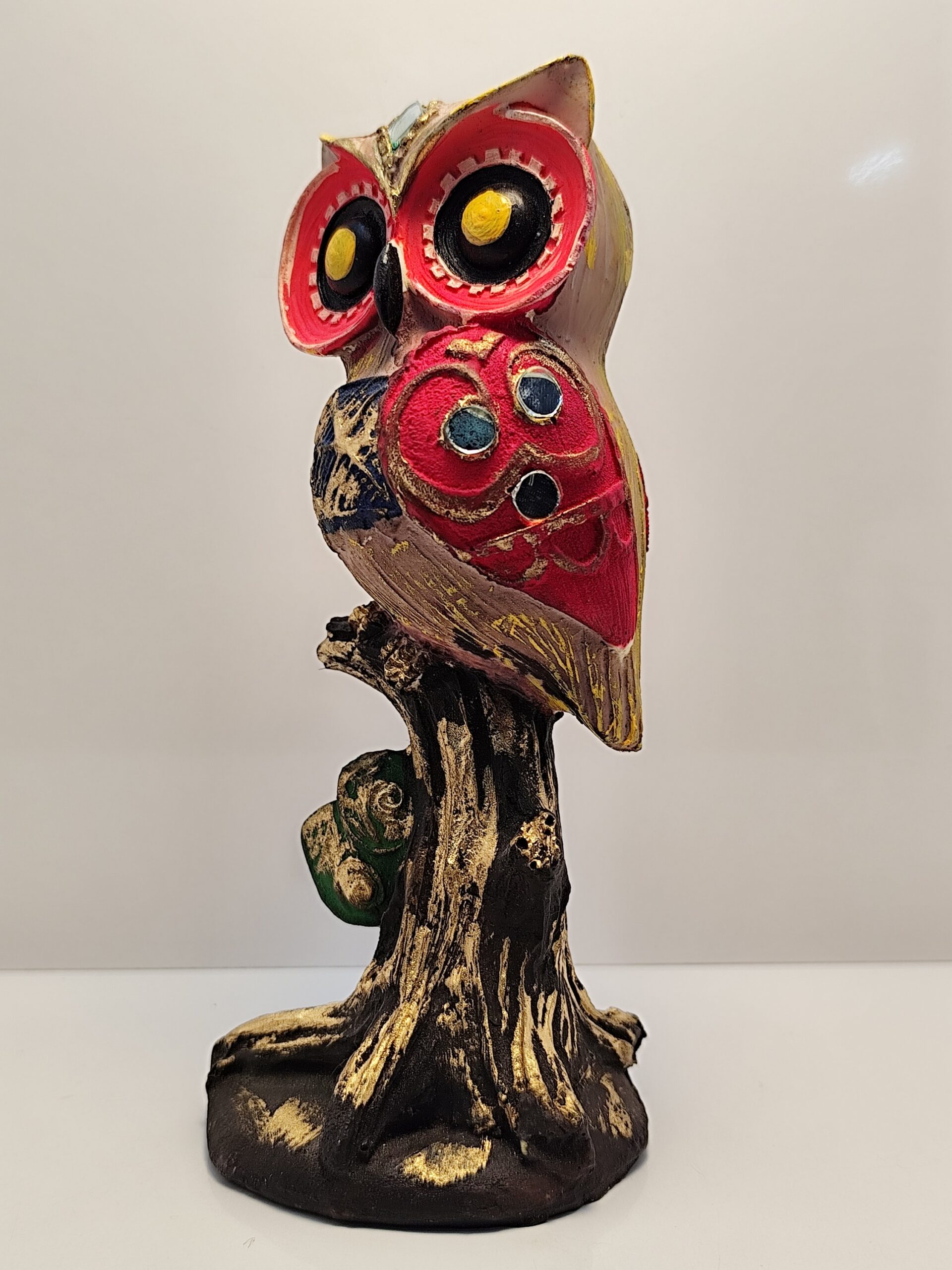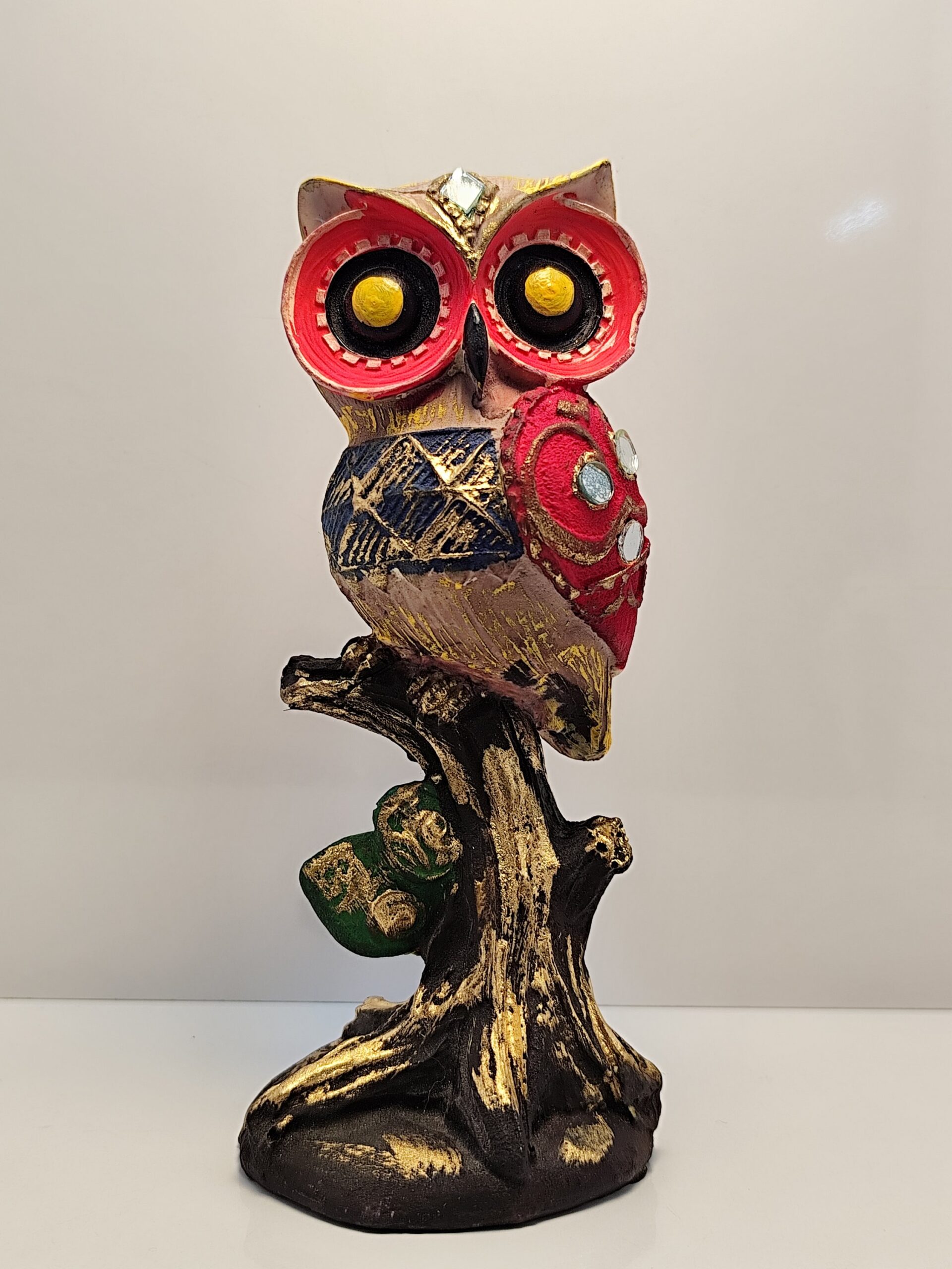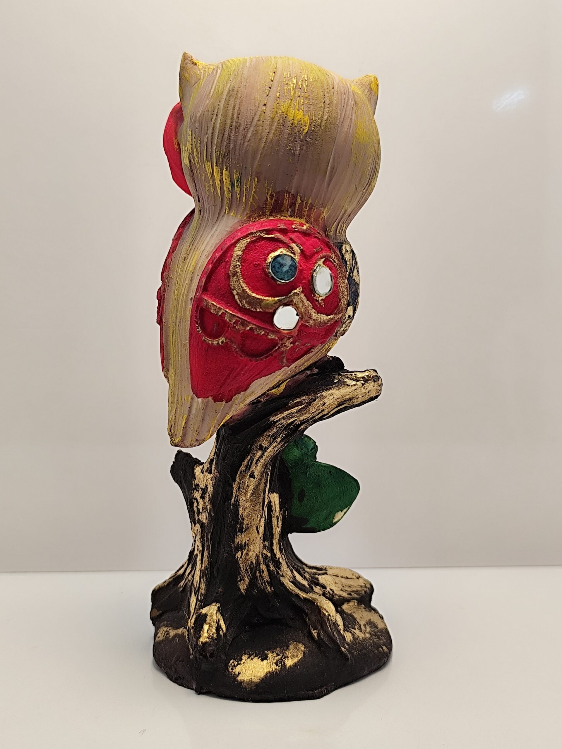 Featuring hypnotic jewel-like eyes, a red ornamental wing, and a beautifully patterned body in navy and gold, this decor piece channels the timeless wisdom of the owl with a modern, regal twist. The base mimics a mystical forest tree, painted in rich brown and metallic gold tones for a touch of luxurious vintage artistry.
