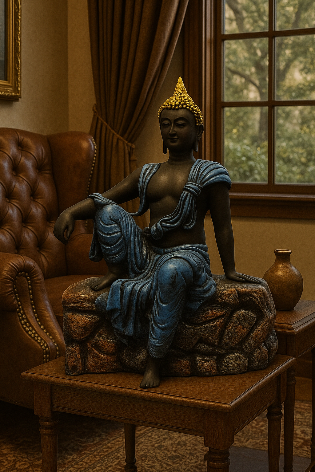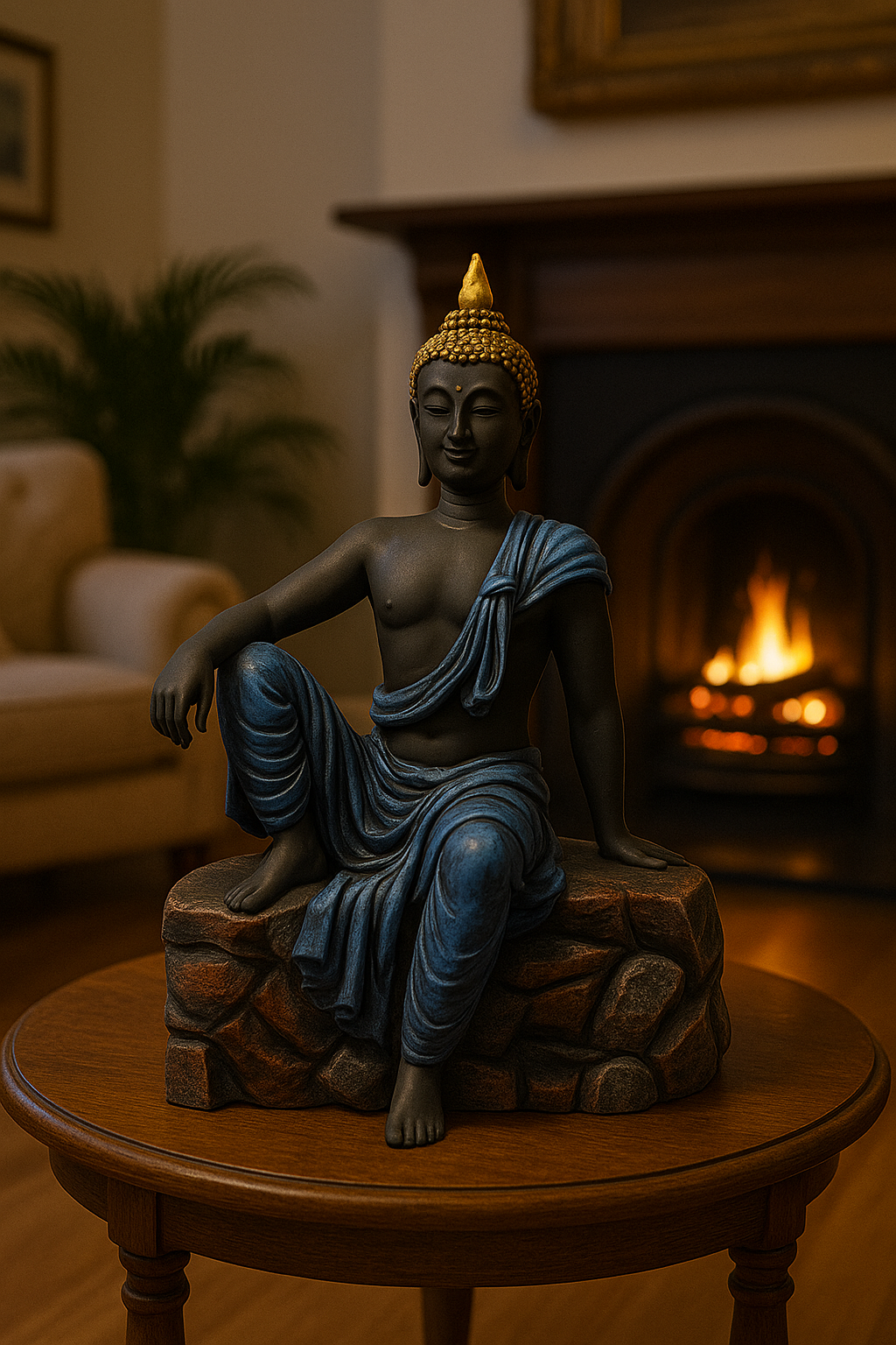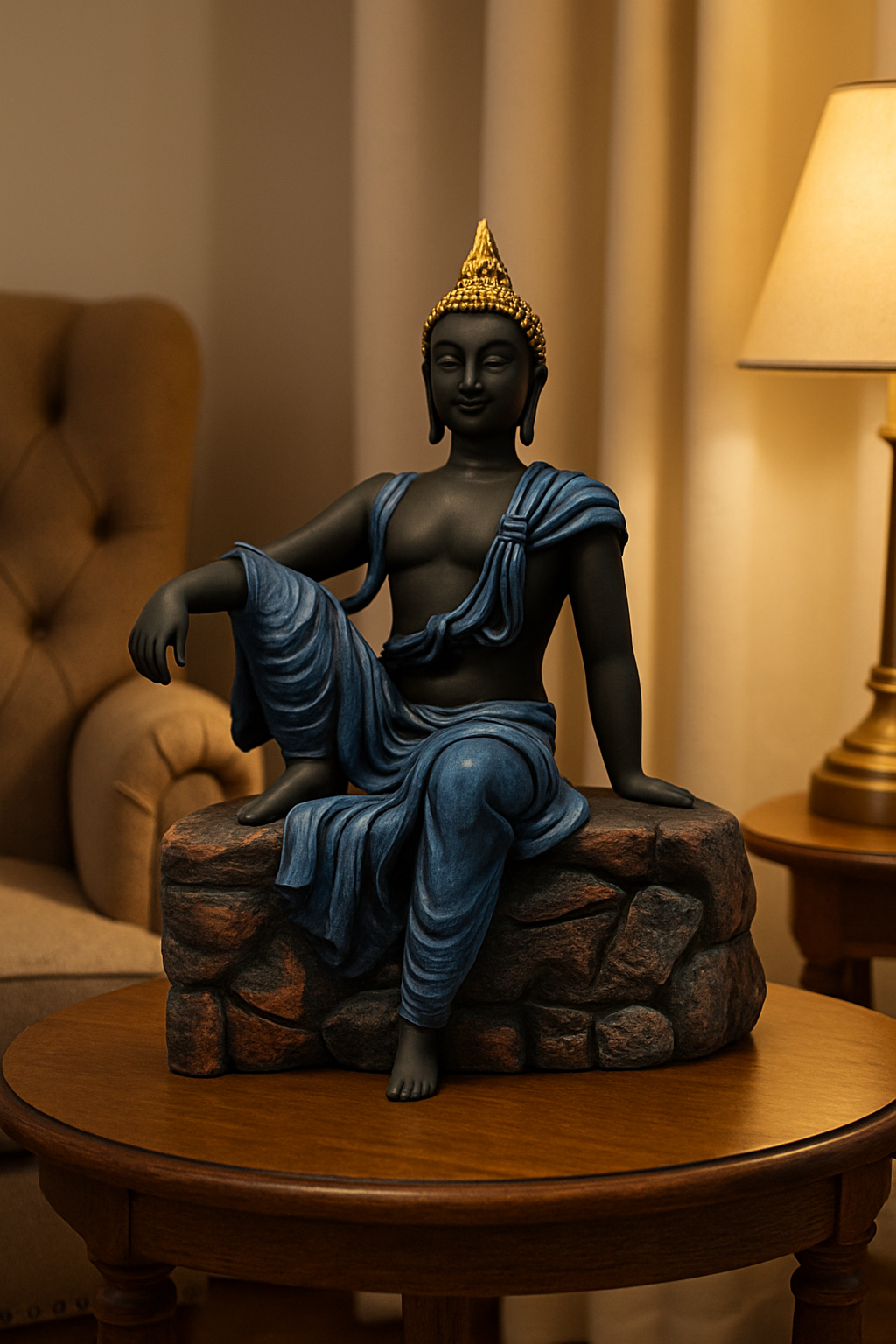 Step into a realm of peace and royalty with The Enlightened Throne, a majestic Buddha statue crafted to bring grace, wisdom, and serenity into your home. Seated on a stone-style pedestal with flowing blue robes and a golden crown, this sculpture embodies both spiritual calmness and artistic grandeur.